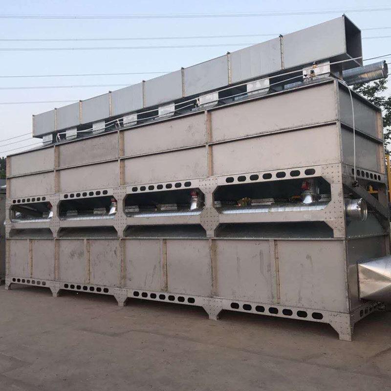 活性炭经过吸附运行一段时间后达到饱和,启动系统的脱附-催化燃烧过程,通过热气流将原来已经吸附在活性炭表面的有机溶剂脱附出来,并经过催化燃烧反应转化生成CO2和水蒸气等无害物质,并放出热量,反应产生的热量经过热交换部分回用到脱附加热气流中,当脱附达到一定程度时放热跟脱附加热达到平衡,系统在不外加热量的情况下完成脱附再生过程。