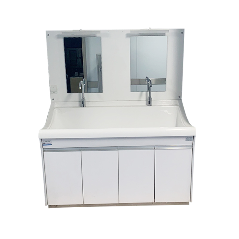 高分子洗手池材质特点:采用高分子材料一次吸塑成型,出水方式有:感应式、膝控式、脚踏式和手动开关,一台洗手池可客户要求选择单一出水方式或多种出水方式。洗手池分高背和低背,高背总高度1800mm,配有美容镜,照明灯,皂液器,可按客户要求配置烘手器和热水器。