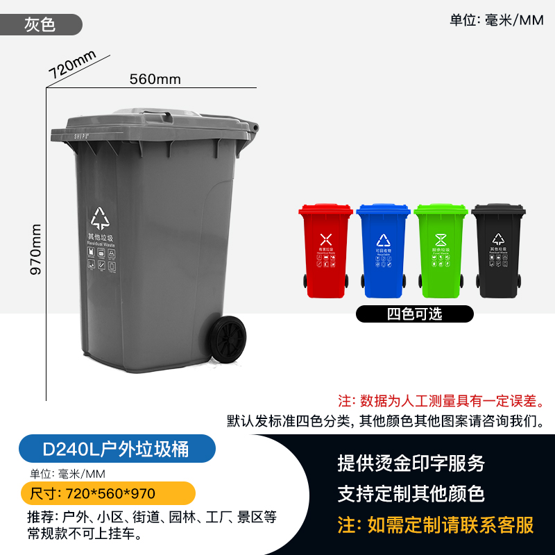供应湖北恩施四色分类垃圾桶 240升环卫垃圾桶——保护环境,从我做起,环卫垃圾桶已成为维护我们环境卫生的一个硬件设施。目前市场上的垃圾桶种类繁多,常出现垃圾桶使用寿命短、变形、易老化褪色、易腐蚀等现象。如果你也担心以上问题,不妨来看看赛普这款垃圾桶。