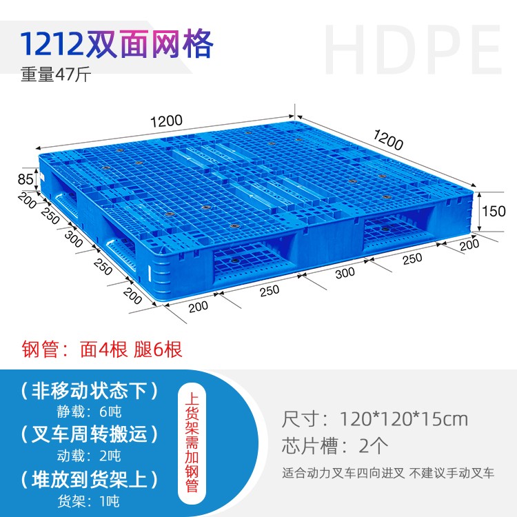 1. 托盘设计:带防滑垫,面部可装12个圆形防滑垫,货叉与双面贯穿,托底12个防滑垫;