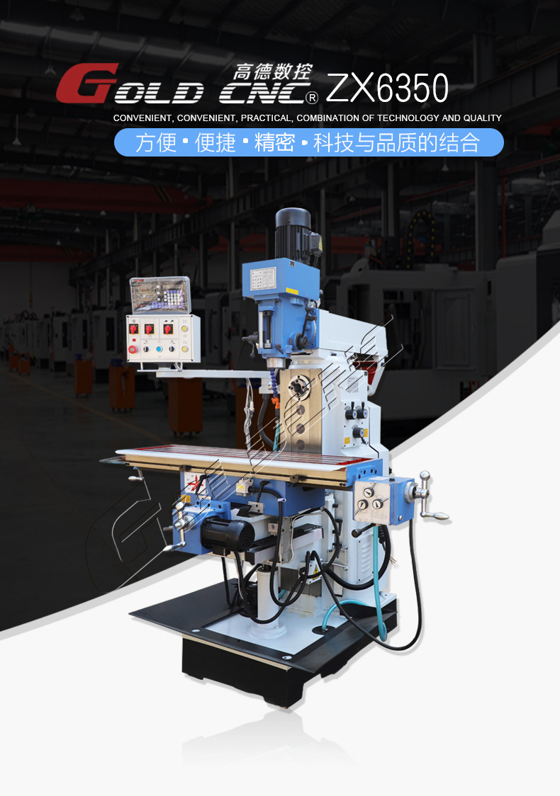 ZX6350钻铣床为方形箱体的多功能钻铣床,立铣及卧铣均为齿轮传动,扭矩传递好,加工效率高装有机械进给器,可实现工作台纵向自动进给,减少了劳动强度,提高了加工精度和表面光洁度。