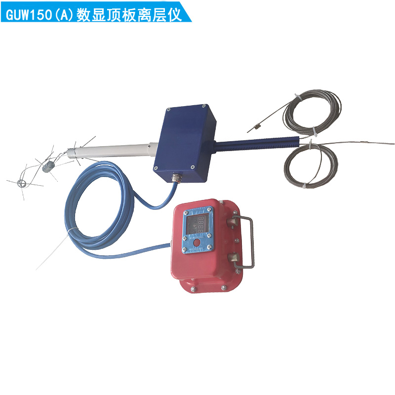 数显顶板离层仪GUW150(A)|矿用围岩移动传感器用于顶板离层位移监测。它由单片计算机控制,集数字显示等多功能为一体,具有体积小、精度高、操作方便、功耗低、携带方便等优点。一种新型数显顶板离层仪,其特征在于,包括:锚爪、钢丝绳、固定装置、分线装置、信号转换装置、信号线和数字显示器,所述锚爪通过分线装置和固定装置伸入钻孔内,连接锚爪的钢丝绳穿过分线装置的圆形通孔后与信号转换装置内的弹簧相连,所述弹簧另一端与拉力传感器相连,拉力传感器通过信号线与数字显示器相连;分线装置两端分别与固定装置和信号转换装置通过螺纹连接。