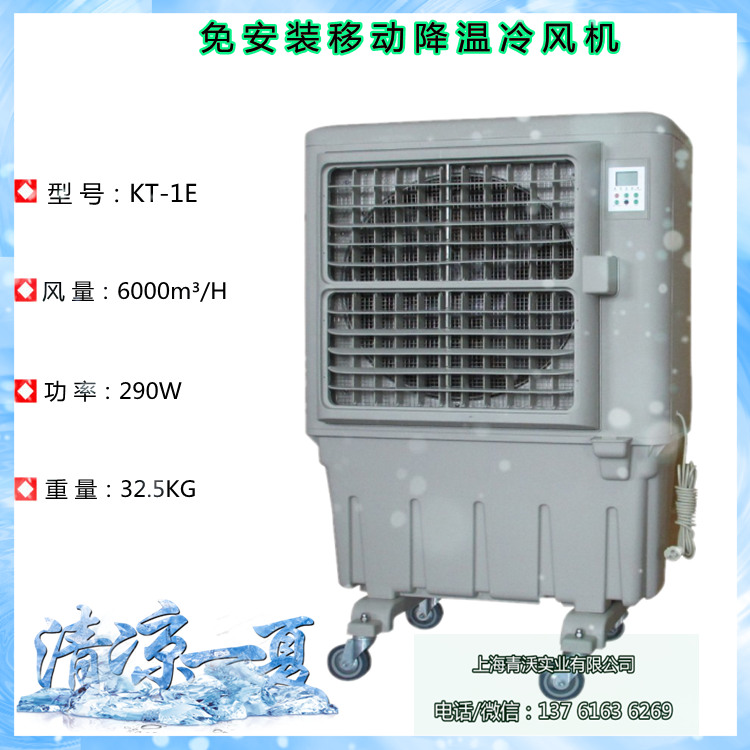 移动冷风机的四周装有使用特种材料的蜂窝状湿帘,具有很大的表面积,通过水循环系统对湿帘不断增湿,在湿帘内部还装有高效低噪节能风机,当风机运行时,湿帘冷风机的产生负压,使机外空气流经多孔湿润的湿帘进入机内,由于湿帘上水的蒸发吸收热量,迫使统经湿帘的空气降温。同时由于湿帘上的水向流经湿帘的空气蒸发,增大了空气的湿度,因此湿帘冷风机具有降温增湿的双重功能。 工业冷风机由于空气始终是从室外引进室内,所以能保持室内空气的新鲜,而且空气愈干热,其温差愈大,降温效果越好。同时由于该机利用蒸发降温原理,因此具有降温和增湿的双重功能(相对温度可达75%左右),在纺织、针织等车间使用,不但能改善降温增温条件,而且还能净化空气,减少针纺过程中的针断丝率,提高针纺织产品的质量。