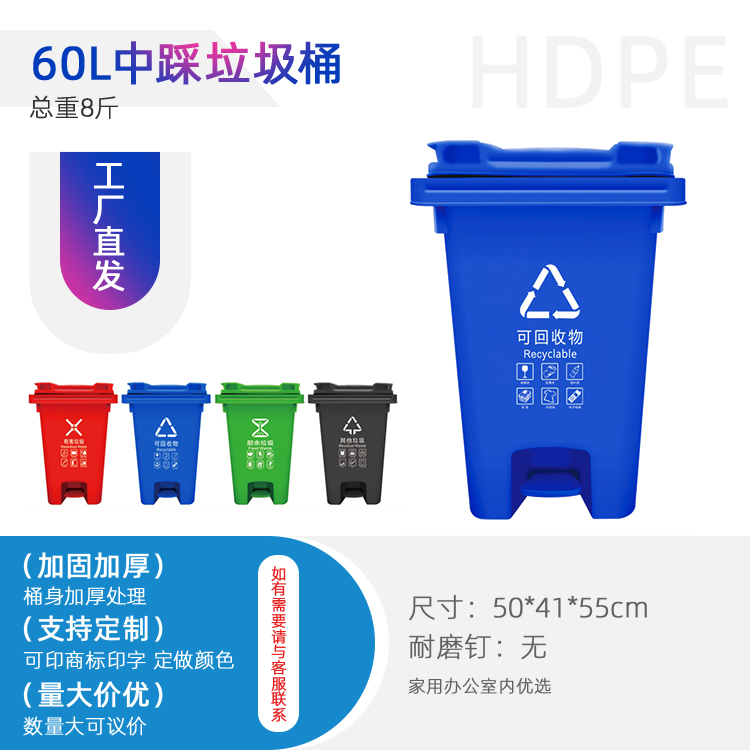 塑料脚踩垃圾桶60L四色分类垃圾箱 结实耐用不脏手