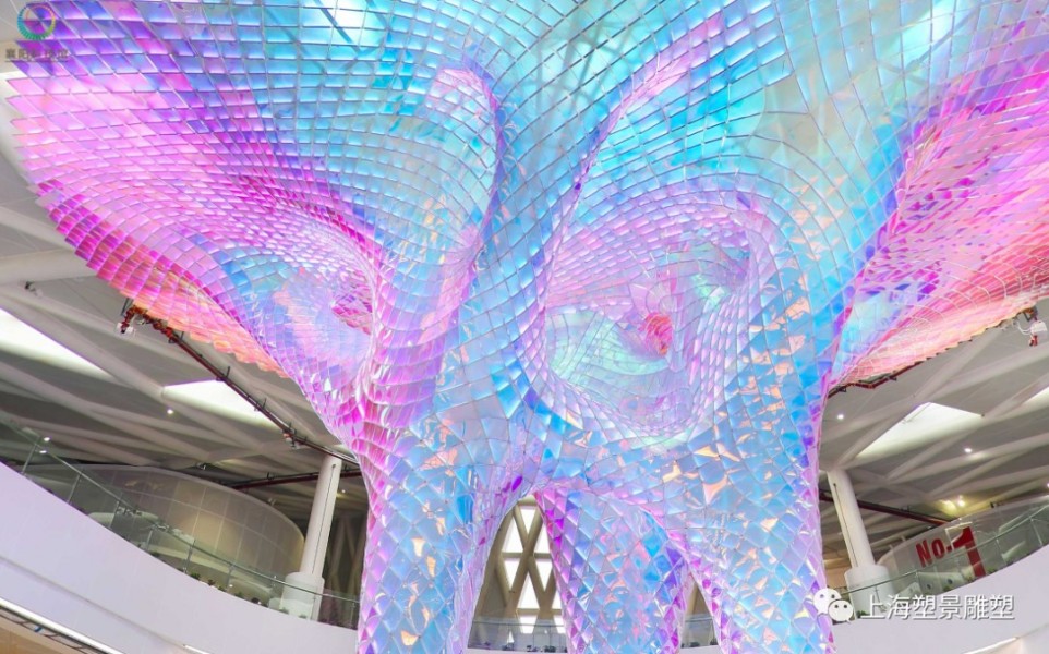 首个大型亚克力材质的雕塑艺术装置,工艺极为复杂。每块亚克力的位置精确到毫米级。弧面的设计使内部钢结构的设计与施工难度剧增,历经数月的奋斗,塑景人圆满完成了作品,创造了世界上最高的亚克力雕塑。