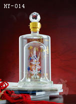 手工艺酒瓶设计的艺术内涵。手工艺酒瓶造型设计是用各种不同的材料和加工手段在空间创造立体的形象。是在确定一个基本形时,采用“雕塑法”为基本千段,进行形体的切割或组合基本形的定位,是来源于几何形体,如球体、立方体、圆柱体、锥体等。很多香水瓶的设计,是在方形、椭圆形的基础上切割或扭转,从而形成多角型的瓶型,加强了工艺玻璃酒瓶的折光效果。化妆品瓶型通常以圆柱体为基本形,而立体构成中的柱式结构主要体现在柱端变化、柱面变化和柱体的棱线变化3个方面,采用对各部位的切割、折屈、旋转、凹入等手法。如:“露美”化妆品成套设计,瓶形沿用了圆柱体造型,但在柱端(瓶盖)上,以切割的手法削去4块,造成4个平面。弧形面与平面的结合,使得电化铝盖金色的亮度较为强烈,增强了对比的视觉效应,感觉新颖。此外,“模拟法”亦是手工艺酒瓶造型的一个设计手段。即直接模仿某一具象形态,以增强商品的直观效果,吸引消费群体。