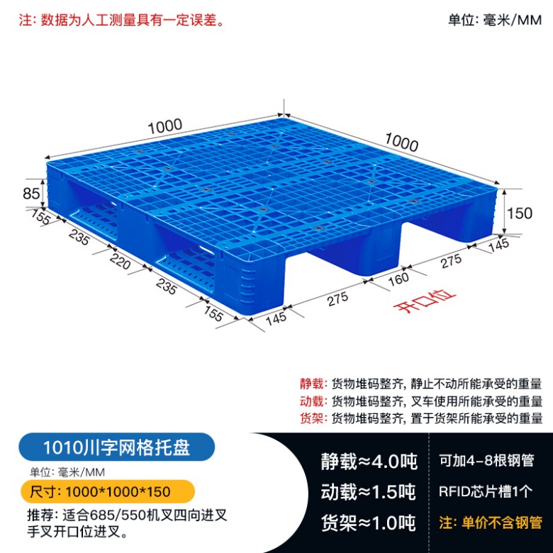 4. 结构特点:川字型、网格型、单面可用、可加8根钢管、芯片槽1个(RFID)。