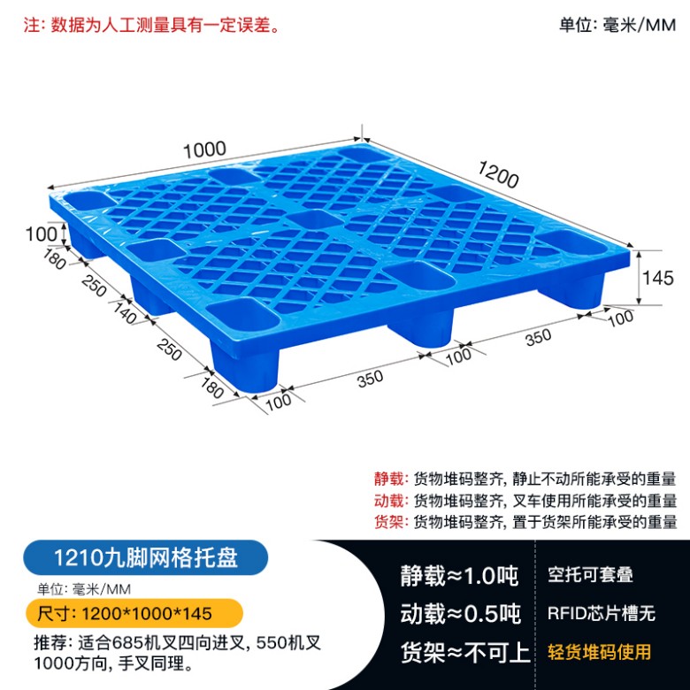 1210轻型九脚网轻托盘采用网状镂空加强筋设计,提高产品整体抗冲击能力,增加产品载重能力及牢固性,全方位的镂空设计具有良好的防潮性,使货物始终处于通风状态使用寿命长且不易损坏。底部脚全采用加固加厚设计,载重性更强,不易崩塌,不易变形,稳固且耐用。托盘表面设有密集小颗粒防滑颗粒,增加产品与货物之间摩擦能力,保证货物在运输过程中不易滑落,安全实用。由于此款托盘不能加钢管及芯片槽且载重能力比较轻,大多数用于轻型货物使用,如商超等行业。注意此款托盘万不可上货架。