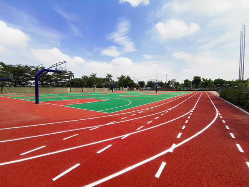 预制型塑胶跑道在产品设计中使用立体网状的内部结构,使跑道具有优良的弹力、强度、韧性及减震效果,有效减少了运动员的肌肉疲劳和微损伤;预制型塑胶跑道由凹凸图案的上、下两层复合而成,上层为彩色复合橡胶,具有长久抵御紫外光及多变气候、气象条件影响的性能,凹凸图案面层设计,具有优良的防滑、抗尖钉、抗磨损、抗反光作用。下层为黑色复合弹性材料,底层设计为凹凸图案,在限度地增加跑道材料与基面的锚固密实程度同时,利用密闭在孔洞中的空气在受到撞击的瞬间所产生的反弹力传导给运动员,从