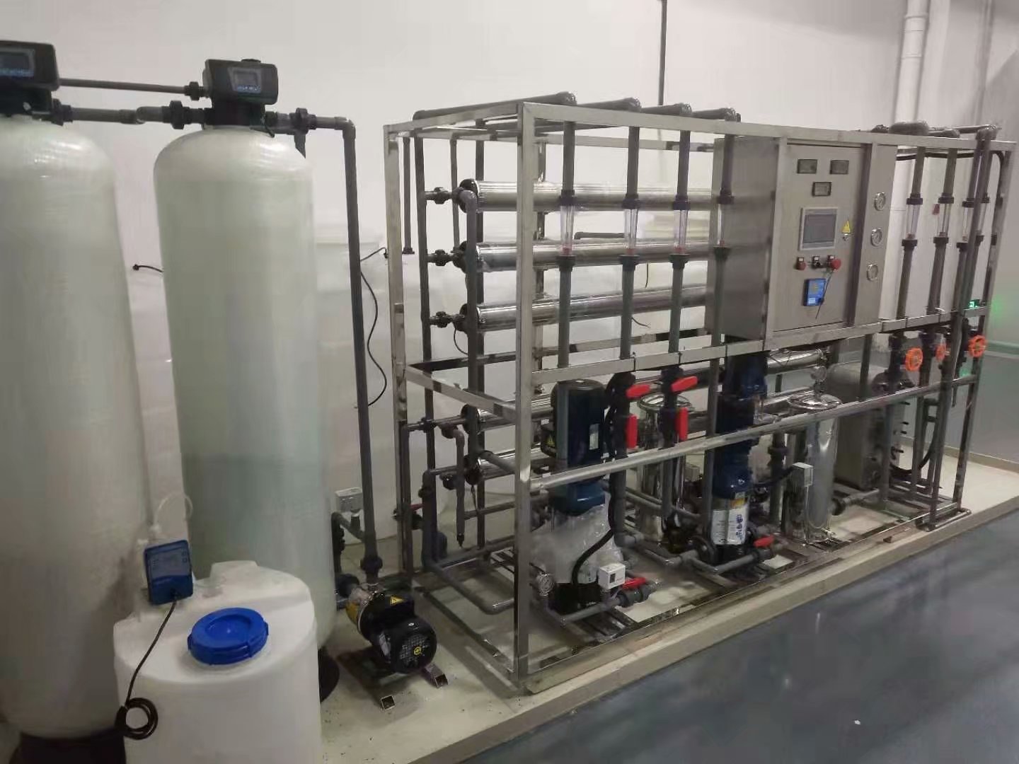2、第二种采用反渗透作为预处理再配上离子交换设备,其特点为初投次比采用离子交换树脂方式要高,但离子设备再生周期相对要长,耗费的酸碱比单纯采用离子树脂的方式要少很多。但对环境还是有一定的破坏性。