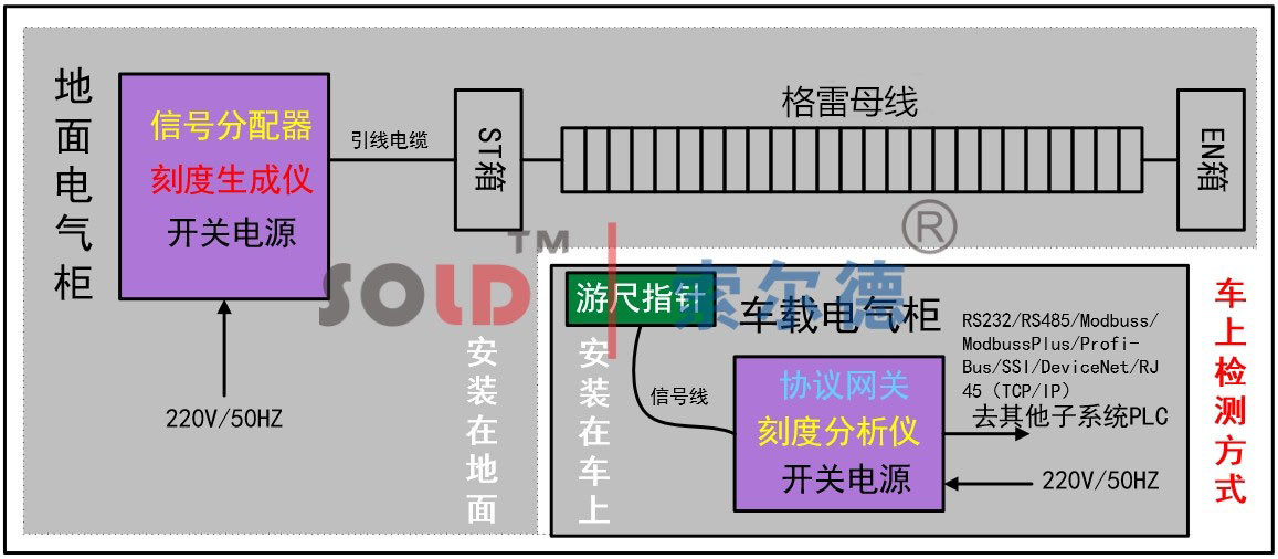 格雷母线位置检测包括地址编码发生器、天线箱、地址器、格雷码母线、协议转换模块及安装辅件等部分。格雷母线位置检测是利用简单的单匝线圈的感应原理,当天线箱线圈中通入交变电流时,在天线箱附近会产生交变磁场。格雷母线近似处在一个交变的、均匀分布的磁场中,每对格雷母线芯线会产生感应电动势。发射单元地址信号通过电磁耦合方式传送到格雷母线的感应环线上。武汉索尔德公司所生产的格雷码母线具有以下特点: