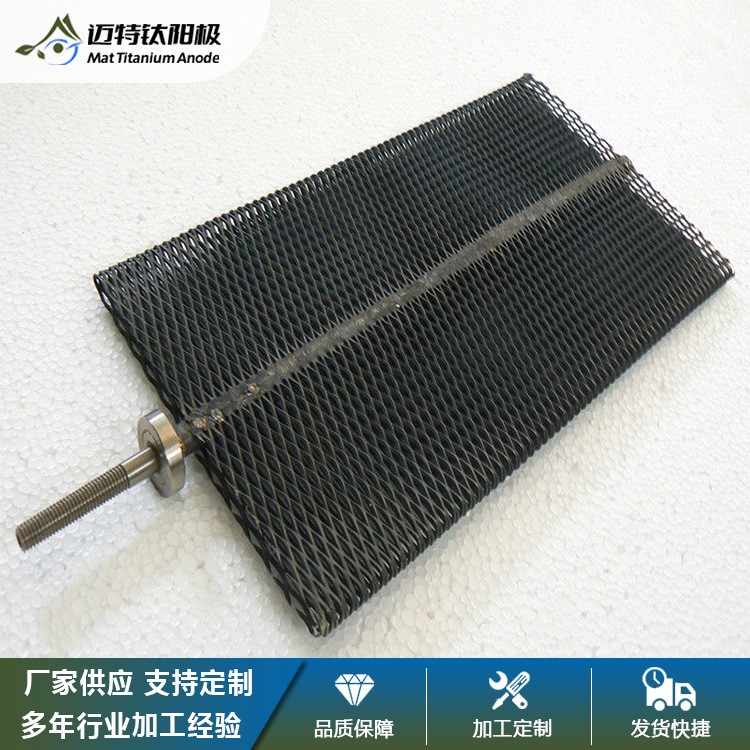 在电解生产中使用铅基合金电极(含Sb6%~15%,或含Ag1%),铅阳极会溶解,消耗了阳极材料,影响了阳极使用寿命,而且溶解在溶液中的铅会在阴极上析出使金属中的铅杂质增高,降低了产品质量。钌系涂层在此工况下会严重破坏,因此不宜使用。初始阳极电位1.48V,1000小时后,升至2.0V,阳极已经钝化。