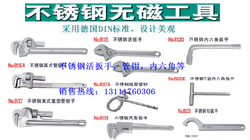 邮箱:281935698@ qq.com不锈钢材质,钛合金扳手,钢制绝缘扳手有:1、各种不锈钢扳手系列,如不锈钢敲击梅花扳手,不锈钢单头呆扳手,不锈钢活扳手、不锈钢双头梅花扳手、双呆扳手、直柄梅花扳手、弯柄呆扳手、两用扳手等; 2、不锈钢套筒及附件类,包括不锈钢套筒头、万向接头、滑行头、接杆、重型套筒扳手、内六角扳手,快速手柄、棘轮扳手等; 3、不锈钢锤子类,如八角锤、奶头锤、德式八角锤等; 4、不锈钢螺丝刀类,如一字螺丝刀、十字螺丝刀、泥子刀、削皮刀、铁皮剪刀、扁铲、敲击螺丝刀等;5、不锈钢钳子类,如克丝钳、尖嘴钳、斜口钳、鲤鱼钳、水泵钳等 6、不锈钢镊子、不锈钢撬棍、不锈钢起钉器等。该产品在一些需要防磁的特殊工作环境中能有效的起到防磁的效果,防止危险事故的发生,确保国家财产和人身安全。活扳手其规格包括:150、200、250、300、375、450、600(mm),相对应的尺寸为:6"、8"、10"、12"、15"、18"、24"。公司还可根据用户的需求,科研人员以雄厚的技术生产实力、良好的企业信誉及多年的生产经验,为客户设计定做各种异型工具及配套产品。