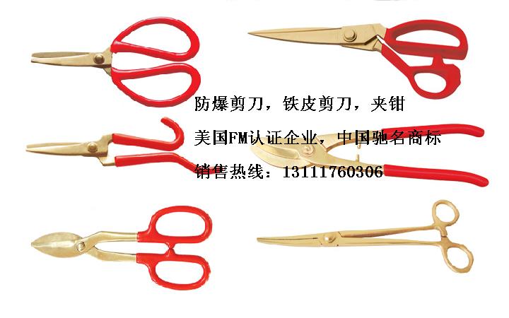 联系人:王心灵 13111760306 ,商务 QQ281935698防爆剪刀:【用 途】切割布、纸、金属薄片、绳、等片状或线状 物体的双刃工具,两刃交错,可以开合。 【制造工艺】模锻产品 【材 质】铍青铜合金、铝青铜合金 【规格及主要技术参数】