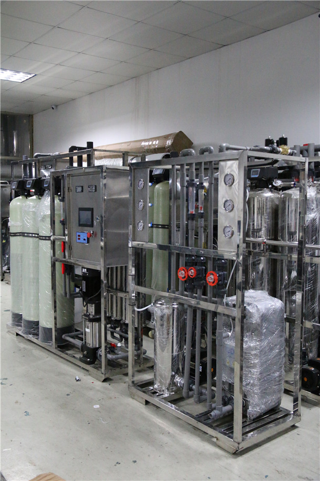 预处理→一级反渗透→加药机(PH调节)→中间水箱→第二级反渗透(正电荷反渗膜)→纯水箱→纯水泵→EDI装置→紫外线杀菌器→0.2或0.5μm精密过滤器→用水对象(≥17MΩ.CM)