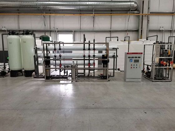 原水→原水箱→原水增压泵→石英砂过滤器→活性炭过滤器→阻垢剂投加设备→精密过滤器→一级高压泵→一级反渗透系统→-二级高压泵→二级反渗透系统→EDI送泵→EDI系统→超纯水箱→供水泵→紫外线杀菌器→后置过滤器→用水点