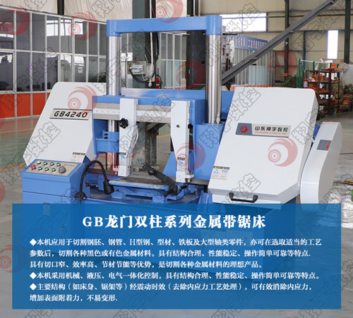 GB4240 金属带锯床应用于切割高度400mm、宽度400mm的钢胚、铁板、无缝钢管及大型轴类零件,亦可在选取适当的工艺参数后,切割各种黑色或有色金属材料。具有可靠性高、效率高和高刚性等显著特点,可代替昂贵的进口设备。