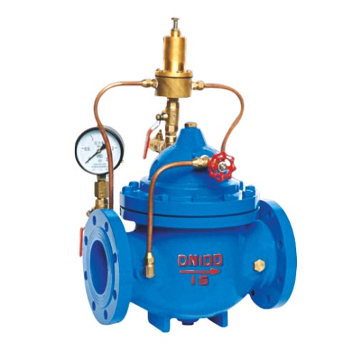 500X泄压/持压阀由主阀、导阀、针阀、球阀、微形过滤器和压力表组成水力控制接管系统。利用水力自动操作,即可以作泄压阀用又可作持压阀用。做泄压阀用时,可维持供水路压力在设定的安全值之下,保持主阀,上游供水压力。其工作原理,当导阀调整为泄压状态时,水通过针阀、主阀控制室、球阀A、导阀、球阀B流向出口,此时主阀处于开启状态。当进口压力超过导阀设定的安全值时,泄压导阀会自动开启,通过球阀C放出部分水,使管路泄压。当压力恢复到安全值时,泄压阀自动关闭,作泄压阀时,各球阀常开。当导阀常开。当导阀调整为持压状态时,只要主阀进口水压底于导阀设定值,导阀即关闭。主要控制使升压,主阀关闭。当主阀上游供水压力超过导阀排至出口,控制室将压主阀开启,开始供水,即保持了上游水压。作持压阀用时,球阀C常闭或用丝堵换下。本产品利用水力自力控制。不需要其它装置和能源,保养简便,一阀多用。广泛用于高层建筑、生活区等供水管网系统及城市供水工程。