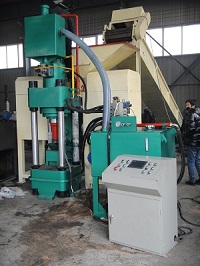 钢屑压块机的结构特征:由上下横梁、液压缸总成、加料缸、模具、料斗、充液总成等组成。上下横梁由立柱和螺母联接,主液压缸前端用法兰联接在横梁底部,模具固定在下横梁上,模套固定在模具内,冲头直接联接在油缸活塞杆顶端,模套和冲头均可拆卸和更换。有一抽板缸位于主机下模具后面,抽板缸位时与模套形成模腔底部,后位时底部形成空间,利于饼块落下,同时具有推饼出模具底部的功能。加料缸和加料斗组成自动加料机构,机器的加料由加料缸的往复动作完成。充液系统位于横岭侧面,以补充主油缸快速前进所需的油液。