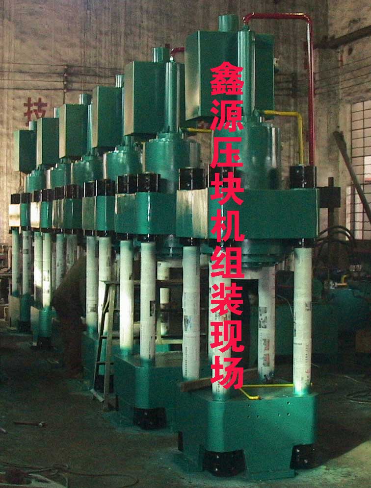 “鑫源”牌全自动液压海绵铁高密压块机能将海绵铁在不加入任何粘合剂的情况下压制成高密度圆柱形饼块(重量2-12公斤),饼块密度可达5T/m³以上(海绵铁含铁量不同,压出饼块密度不重量也不相同)。