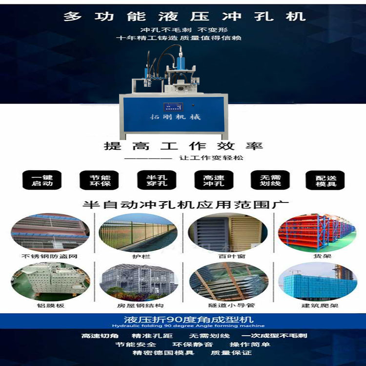 本产品广泛用于冲不锈钢防盗网、楼梯扶手、护栏、各类鞋架、衣架不锈钢管(圆、方管)、锌钢、彩钢、铁管、铝合金、货架等冲孔;护栏冲尖一次冲压成型;可根据客户需求定做多个工位的冲床;整机自带定位杆刻度尺,定位精准、冲口平整;可任意调节对穿.