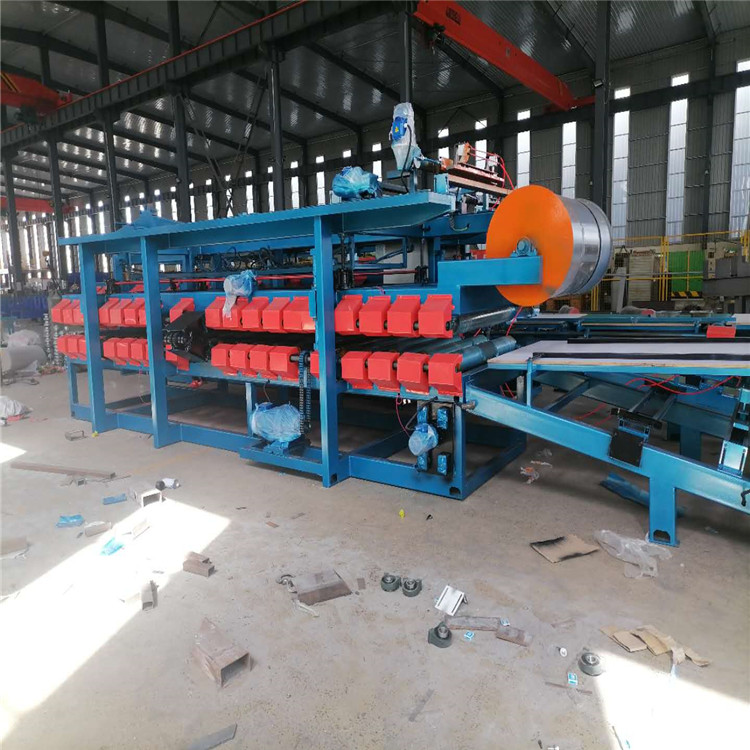 多功能金属隔热夹芯板复合板机组由单层压型板机、复合板机组成一条流水线,集压型机、复合机先进的生产工艺于一体,能一次性复合成多种复合板,克服了传统板先压型后手工复合的缺点,且压型机、复合机各自能独立生产。全套流水线压型机部分由装料开卷系统、成型主机、切断装置组成,复合机部分由装料开卷、喂板、压筋、涂胶、加温、复合、卷边、翻边(企口用)、开槽、整边、气动、自动切割、工业电脑控制系统组成,本机采用精密低速计量泵、变频调速、(或无级调速)、电脑控制,计量准确。本机可复合多种规格型号的平板、瓦楞板。能生产厚40-300MM,宽950-1200MM的夹芯复合板;厚50-300MM,宽950-980MM的瓦楞型高强度复合板。本机适合彩色钢板、铝板、不锈钢板等为外复合外层材料,内层为阻燃型EPS、岩棉等材料。整机采用机电一体化,单板