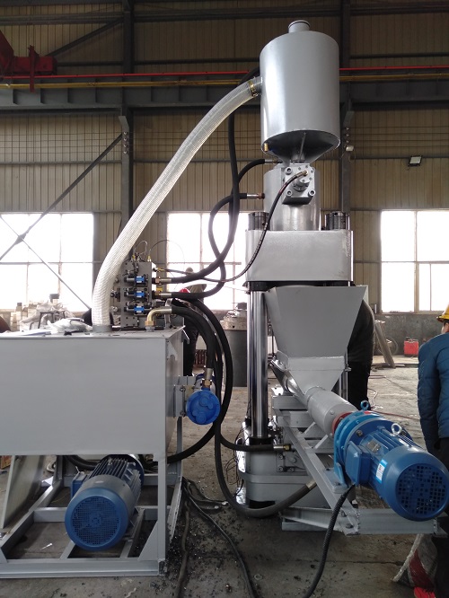 主机由上下横梁、液压缸总成、加料缸前端用法兰联接在横梁底部,模具固定在下横梁上,模套固定在模具内,冲头直接联接在油缸活塞杆顶端,模套和冲头均可拆卸和更换。有一抽板缸位于主机下模具后面,抽板缸前位时与模套形成模腔底部,后位时底部形成空间,利于饼块落下,同时具有推饼出模具底部的功能,加料缸和加料斗组成自动加料机构,机器的加料由加料缸的往复动作完成,充液系统位于横梁侧面,以补充主油缸快速前进所需的油液。
