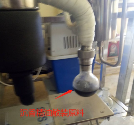 水蒸馏工艺:清洗香材→抽湿凉干→粉碎→专用不锈钢炉蒸馏→保持50小时100℃循环回流密封蒸馏后,得到少量的沉香精油,萃取率约千分之一。