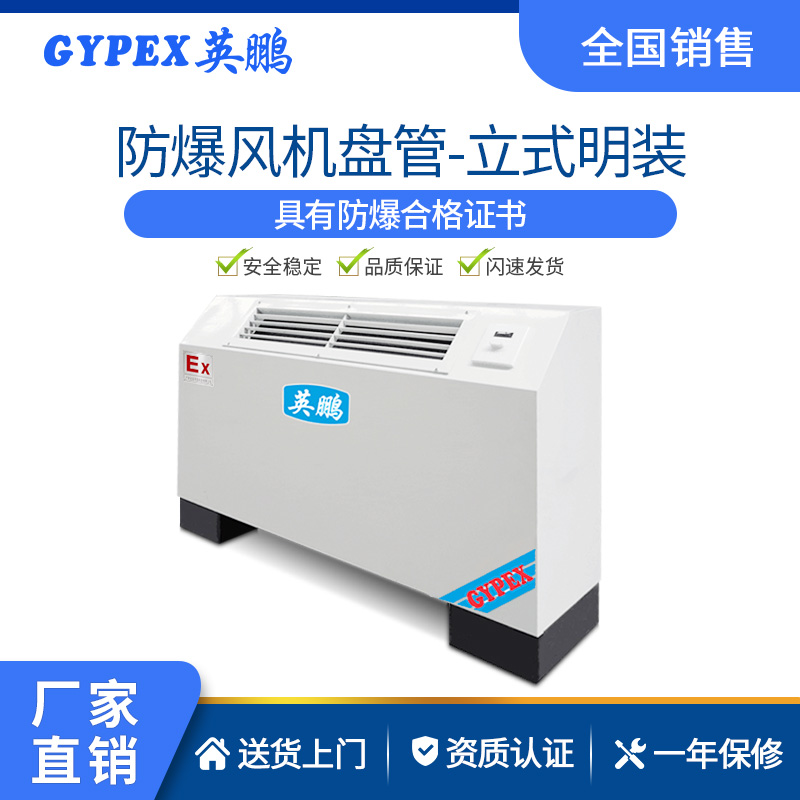 防爆立式明装风机盘管是防爆中央空调的末端产品,由热交换器,水管,过滤器,风扇,接水盘,排气阀,支架等组成,其工作原理是机组内不断的循环所在房间的空气,使空气通过冷水(热水)盘管后被冷却(加热),以保持房间温度的恒定。通常,新风通过新风机组处理后送入室内,以满足房间新风量的需要。
