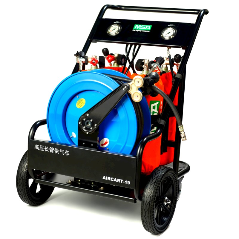 移动式长管呼吸器(小推车呼吸器)属于压车载式移动供气装置,可不依赖于环境气,给作业人员提供呼吸保护。呼吸用的空气由压缩空气瓶通过集气块,减压器,压供式供气阀和面罩提供给使用者。呼出的气直接排入环境气中。在使用本产品过程中,中压供气管的总长度不得超过 80 米(推车自带中压供气管 加延长管供气管的总长度)。 在 IDLH 环境使用时,必须和逃生呼吸器配合使用。
