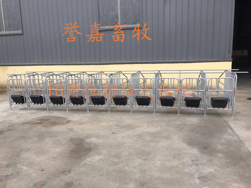 2.0镀锌钢管母猪定位栏,主要供应大型猪场使用,成本低质量好,组装方便,可为猪场有效节省占地空间,每套可供10头猪使用,每套11片围栏,配电前门,后门,母猪食槽可配带,也可自己做,定位栏也可定做母猪位70宽的,管2.5厚的(中间又差价的哦)