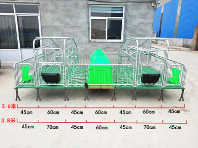 床架用镀锌管焊接而成结实、耐用、抗老化、大架均采用1寸镀锌管,前门后门围栏均采用6分管,配有2个钢板食槽,2个小猪挂饰食槽(塑料的)