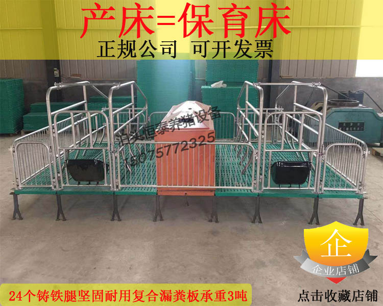 母猪产床又称高培产仔床、、高床产仔栏,是一种新型的母猪保育产床,它适合于大、中、小型规模的养猪厂。床底采用铸铁加塑料或全塑料,边框采用优质热镀锌钢管焊接而成。底部全部采用球墨铸铁框架,承重更好耐腐蚀耐酸碱更强。因高出地面所以具有一下特点,母猪产仔期间卫生条件优良,所排污物延漏缝板渗漏,保证了仔猪的卫生,免受感染。能有效避免母猪压伤、挤伤猪仔,并且仔猪比地面仔猪增重快。是专为母猪分娩和哺乳仔猪而设计的专用栏圈。杜绝了积水积尿积粪现象,让母猪远离肮脏潮湿的生活环境。母猪产床的分栏设计,杜绝小猪被母猪压死、踩死,并且由于母猪、小猪不接触地面而有效的预防各种疾病的传播。新的母猪产床设计,引领母猪产床发展方向,产床配件