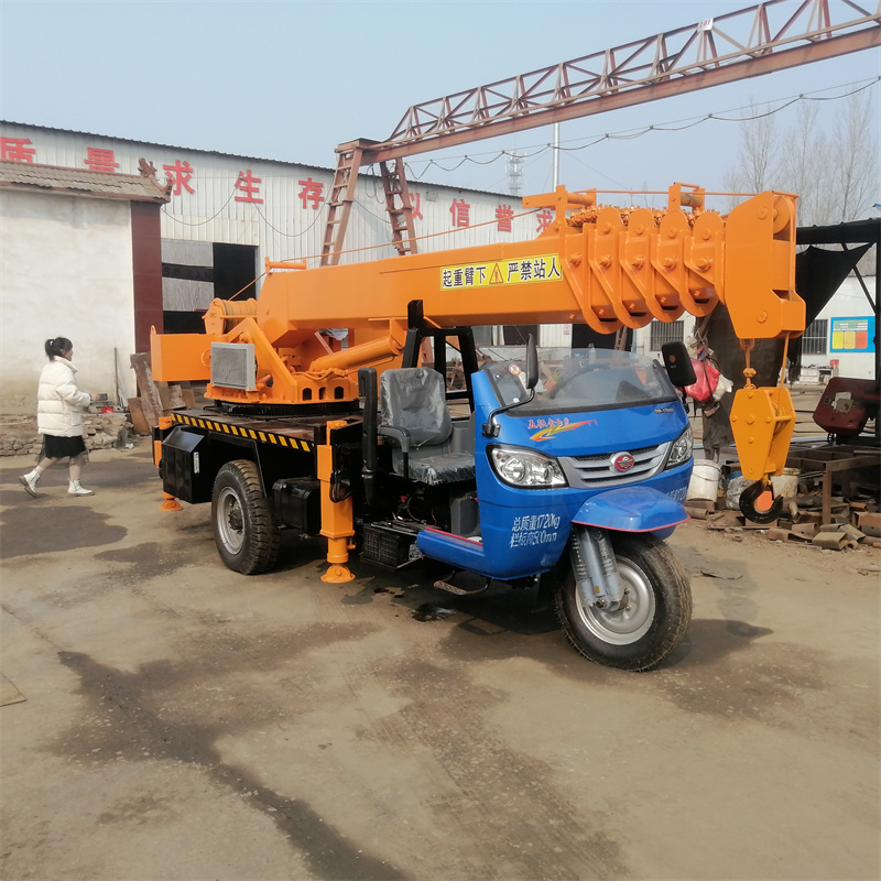三轮车吊是一种通过液压举升及伸缩系统来实物的升降、回转、吊运的设备。通过对三轮车吊控制系统的操纵,驱动动力装置(电动机或内燃机、将动力能量输入),借助金属结构和工作机构(起升机构、运行机构、变幅机构、旋转机构或行走机构)单独或组合运动,带动取物装置通过吊、抓、吸、夹、托或其他方式,在较大空间范围内完成对物料或设备的搬运或吊装任务。三轮车吊的金属结构将各工作机构、传动装置、电气设备等通过不同的配合、组合、连接,安装调试,组成一个整体,并承载起重机的自重和吊重。
