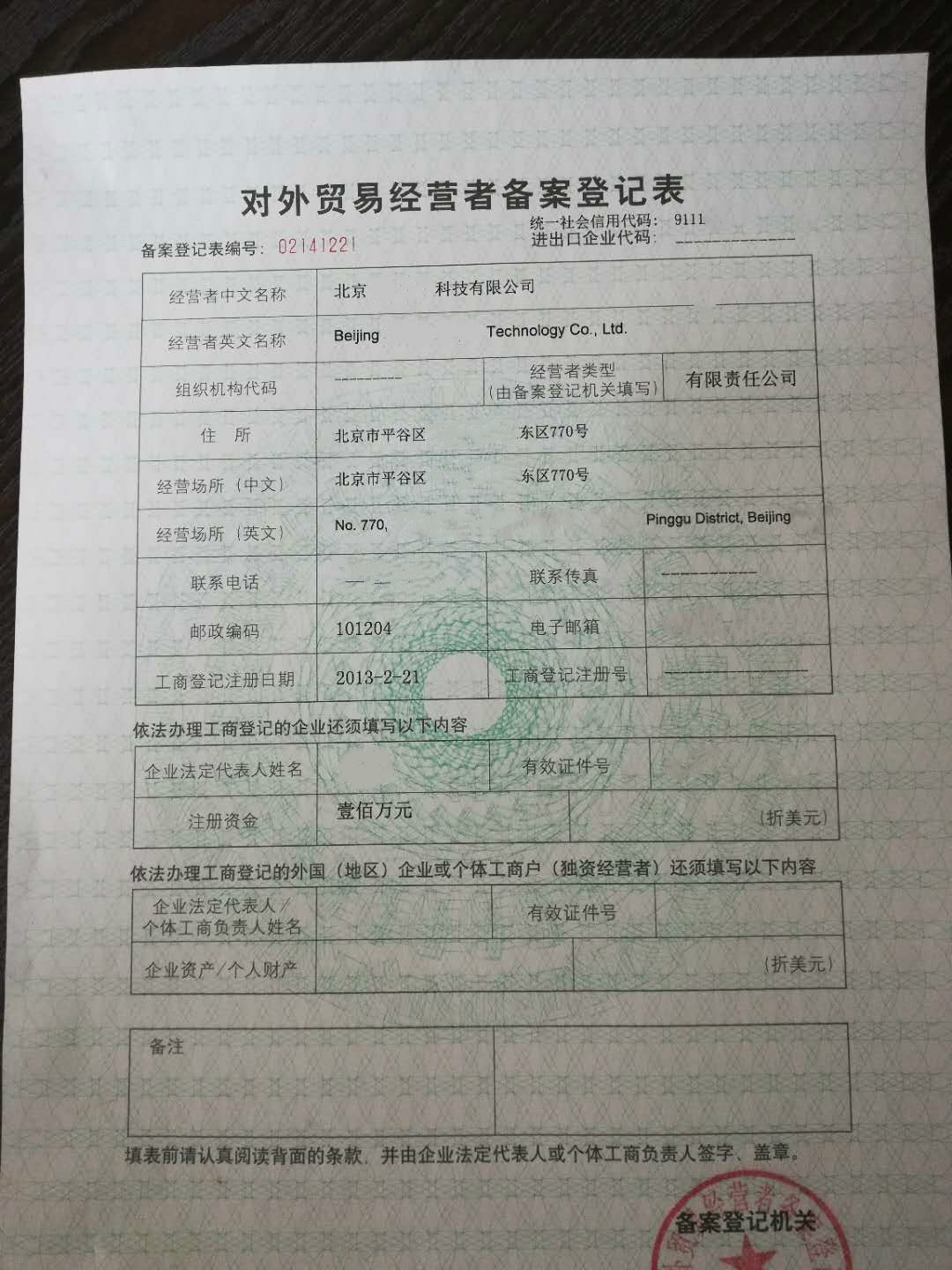 企业经营范围需含有“进出口”字样。对外贸易经营者先行上网登录资料商务部统一业务备案平台,在线填写并提交成功后,系统给出序号,记录此序号并在打印时输入。在打印出的《登记表》第二页盖公司公章、法定代表人或分支机构负责人签字或人名章。系统中可上传此《登记表》及营业执照复印件,保存附件,上报。若在线填报时已上传此表扫描件,则不需窗口提交此表纸质版。