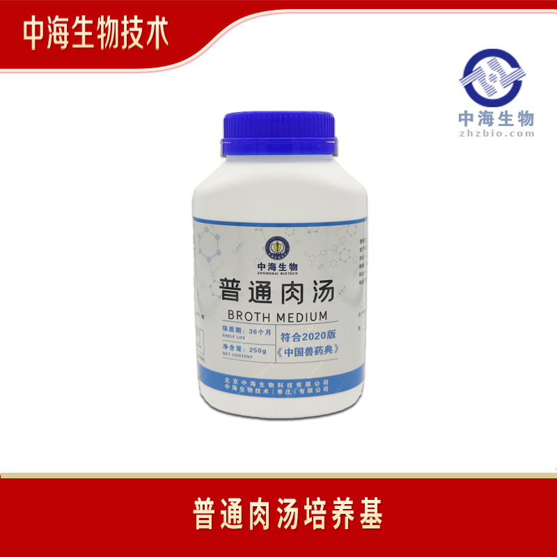 中海生物技术普通肉汤培养基用于一般细菌培养、复壮、增菌等,也可用于消毒剂定性消毒效果测定的干粉培养基1300-1⑨30-979 中海普通肉汤培养基是常用的基础培养基,它可作为一些特殊培养基的基本成分,再根据某种微生物的特殊要求,在基础培养基中添加所需营养物质ZHzBio.CoM 基础培养基:含有细菌生长繁殖所需的基本营养物质,可供大多数细菌生长。在牛肉浸液中加入适量的蛋白胨、氯化钠,调节pH7.2~7.6,经灭菌处理后,即为基础液体培养基;如再加入0.3%~0.5%的琼脂,则为基础半固体培养基;加入1%~2%的琼脂,则为基础固体培养基。