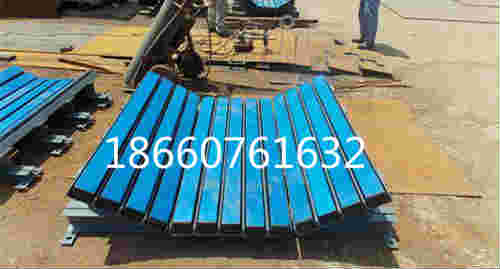 也可根据需求提供在受料点处的缓冲槽型支架,这些支架需与皮带机上的承载托辊尺寸一致。因此,订购时需注明:形状和两侧倾角(25°-35°-40°);与中心托辊最高处的距离;