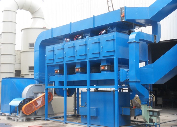 催化燃烧设备在工作时先将有机废气用活性炭吸附,当活性炭达到吸附饱和时停止吸附操作,然后在适当温度范围内使活性炭发生脱附;脱附下来的有机物浓度较原来提高几十倍并送入催化燃烧室进行催化燃烧反应,在催化剂表面于200~350℃条件下进行催化氧化反应,使其转化为无害的水和二氧化碳。
