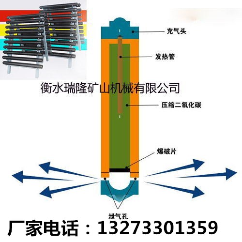 二氧化碳属惰性物质且十分稳定,又具阻燃功能。不与周围的液体、气体相融合,不受高温、高湿、高寒环境的影响。起爆过程无震荡短波、无明火、无电弧、无危害物质产生,警戒距离短,相变技术致裂器,不产生哑炮,基本无粉尘。属物理做功非化学裂变。遇到震动、摩擦、撞击均不会启动,充装、运输、存储、包装安全可靠。先将密封圈和破裂片,加热棒装入高压高压钢管内,拧紧合金帽,再将液态的二氧化碳通过填充器压缩至高压钢管内,再用线路测试器检测高压钢管内气压是否达标。这样即完成了起动前的准备工作。将高压钢管插入事先钻好的孔中,并通过专门的部件固定好钢管,将起动器的电源与加热器连接,当微电流通过加热棒时能瞬间将内部的液态二氧化碳加热使之转换为气体,随着管道内的二氧化碳气体体积的急剧膨胀被扩大到600倍,当压力持续增大达到40000PSI时破裂片被击穿,随即通过泄压头以几何级当量释放出二氧化碳气体清除堵塞物料,开封相变技术,从启动至结束整个过程仅需4毫秒。
