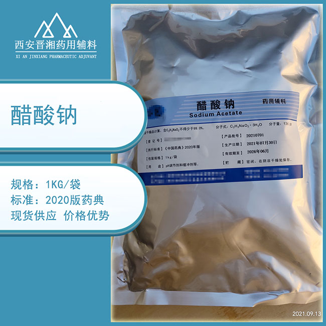 按干燥品计算,含C2H3NaO2不得少于99.0%。性状:本品为无色结晶或白色结晶性粉末;微带醋酸味。