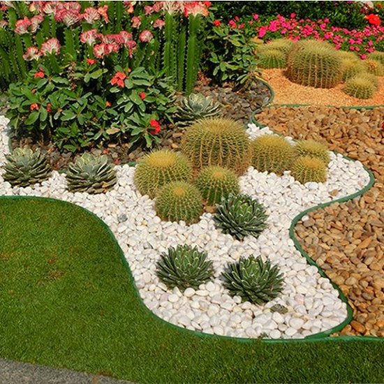 这种PE材质的草石隔离带具有耐氧化,高韧性,无异味等特点。由于其成本低,小物件起到大作用,所以被广泛的应用于园林景观中。