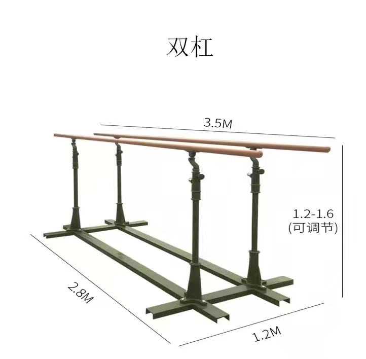 军用双杠参数:杠面材料:加强型尼龙纤维杠面,内芯28MM弹簧钢,高强度抗老化塑料颗粒, 吸收水份不易打滑,杠面重量36KG每付。杠面长:3.5M,杠面直径40毫米*50毫米的卵形,外表为尼龙塑料颗粒注塑而成.不怕阳光暴晒。立柱:外管直径4.2CM,厚3MM,升降杆直径为28MM的冷拔钢,强度高,间隙小。槽钢底座:厚度为3.5MM,尺寸:2.8米*1.2米5*10cm槽钢,杠面可调宽度:45-55CM 杠面可调高度:1.2-1.6米。底座整体尺寸长:2.8M,宽1.2M,总重量为145KG