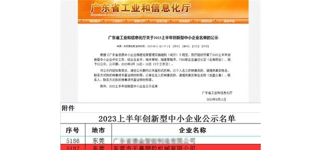 喜报|东莞市天赛塑胶机械有限公司通过“创新型中小企业”认定