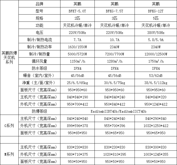 广州英鹏防爆空调系列机型通过特殊防爆技术加工处理,广泛应用于国防、科研、石油、化工、医药、加工制造、生物等存在ⅡA、ⅡB级,T1~T4组可燃性气体、蒸汽与空气混合形成的易引发爆炸的危险场所,是针对有温度控制要求场所设计的特种调温空调设备,系列产品均通过防爆电气产品质量监督检测中心检验,获得防爆电气设备防爆合格证:防爆空调机CNEX12.1495/1496;其外形美观,设计合理并具有安装维修方便等特点,全系列防爆产品内部采用名牌压缩机、微电脑控制、数字显示,具有噪声低、性能稳定、操作简便等优点。深受广大特需行业客户喜爱,并以部分录入特需行业定点采购名录。