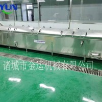 特点:采用食品级材料可靠。输送平稳,速度可调,物料随输送带的行进运动,能够避免对输送物的损坏。噪音较小,适合于工作环境要求比较安静的场合。结构简单,便于维护。能耗较小,使用成本低。设备配备上漂压网带,可以防止产品在水中因浮力作用产生上浮滞留现象。本机以热水为介质,分杀菌槽、冷却槽两部分。整体采用不锈钢制作,可根据包装物的要求对温度和时间进行任意调整。该机结构紧凑、操作方便、故障率低,加热方式采用锅炉蒸汽或锅炉热水,特别适合连续杀菌作业。设备采用手自控温系统,水质升温快、受热均匀、温差小温度可调,适合于不同产品的连续性巴氏杀菌。水浴式灭菌功能可有效的将物料均衡的混合在介质水中,提供了对物品的杀菌效果,可调速式输送系统可有效的控制产品的灭菌时间,合格的完成产品的灭菌工艺。