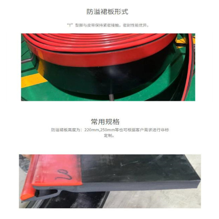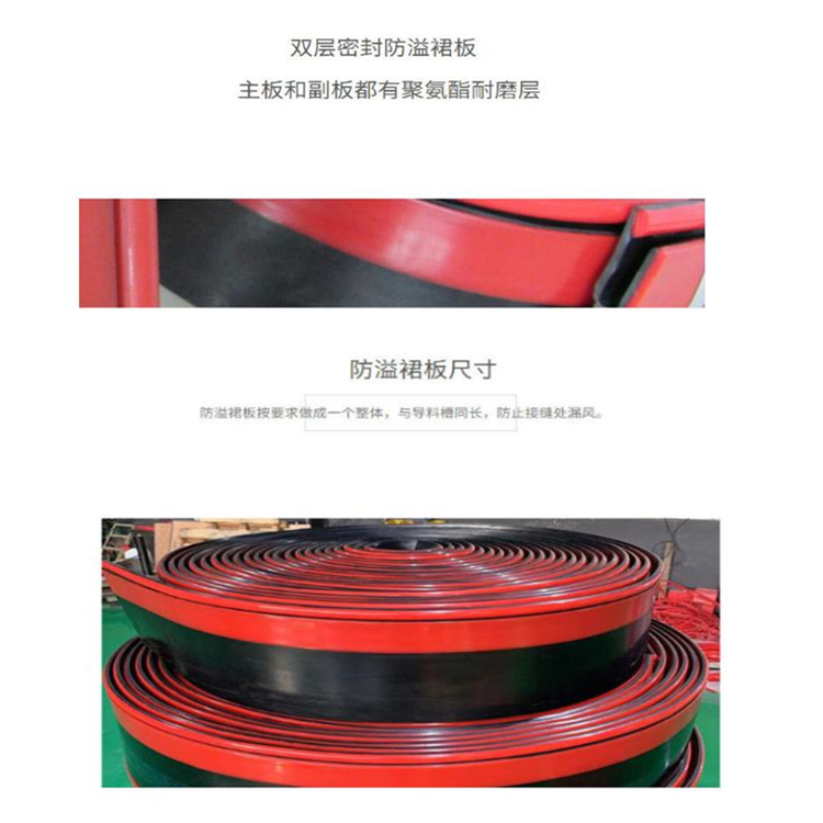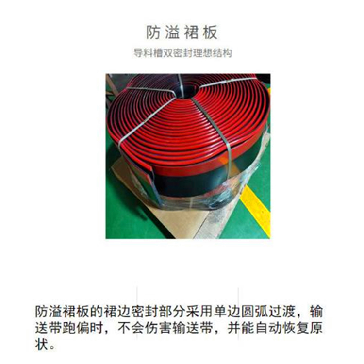 防溢裙板-导料槽防溢裙板的主体部分为黑色,采用y质T然橡胶和丁苯橡胶混炼而成,在保持挺括的基础上增加弹性,使绿色的多护密封条紧密的贴服在输送带上,甚至当多护系统达到使用寿命后能够继续履行防溢裙板的职责,保护使用厂皮带不受伤害。山东美奂橡塑